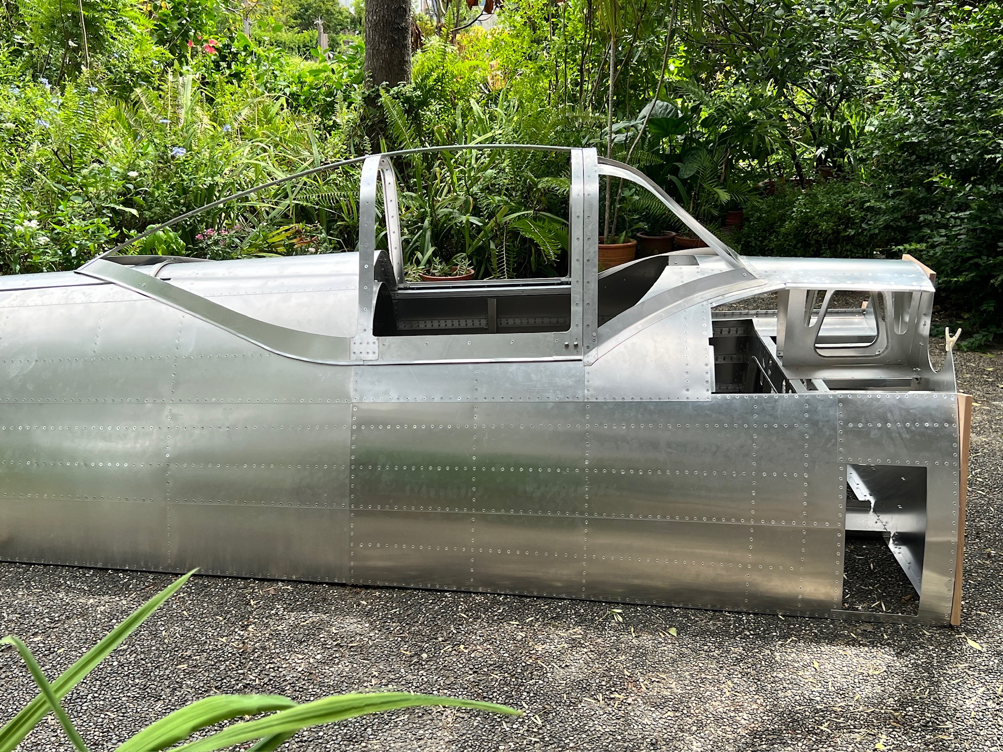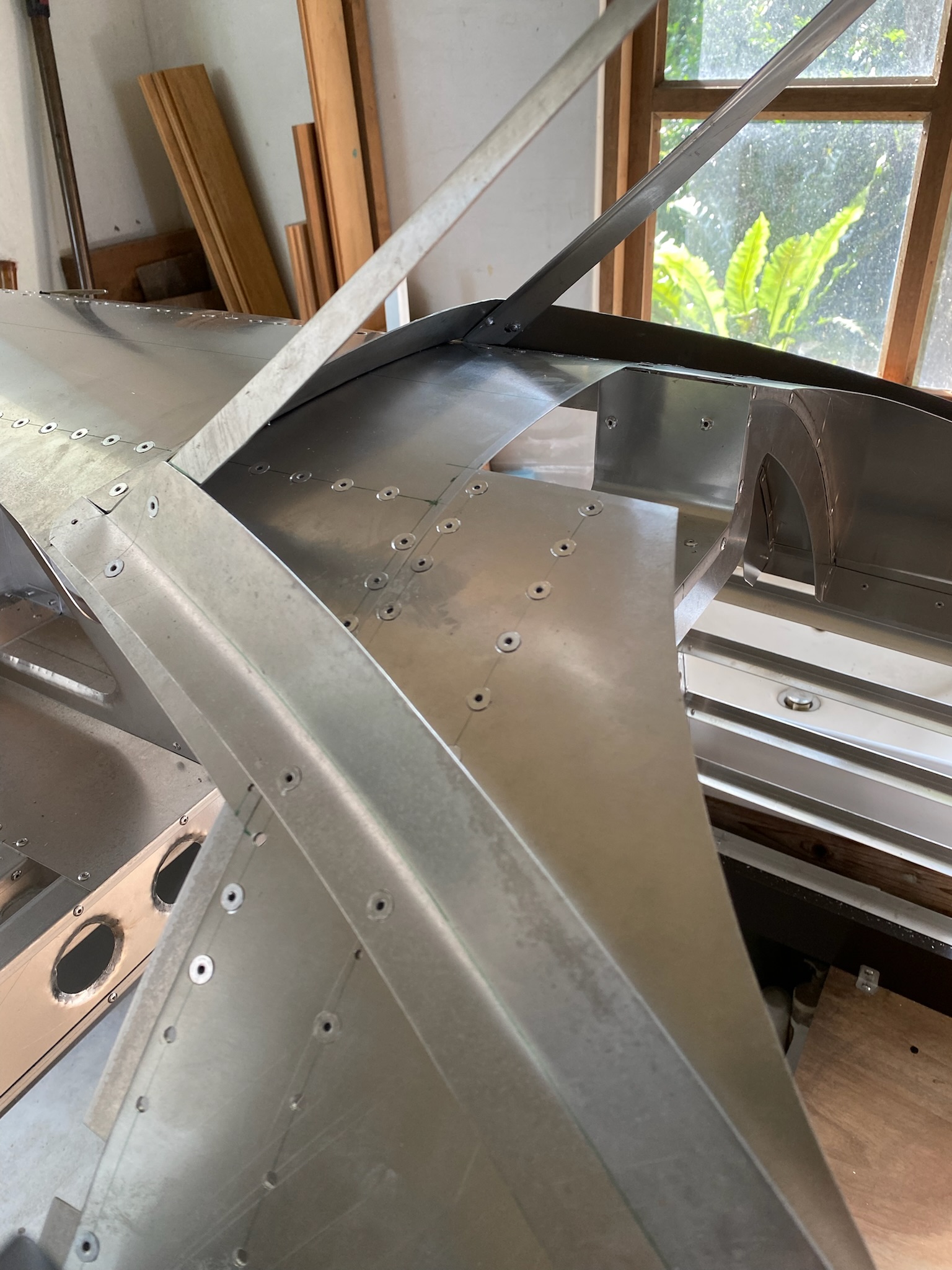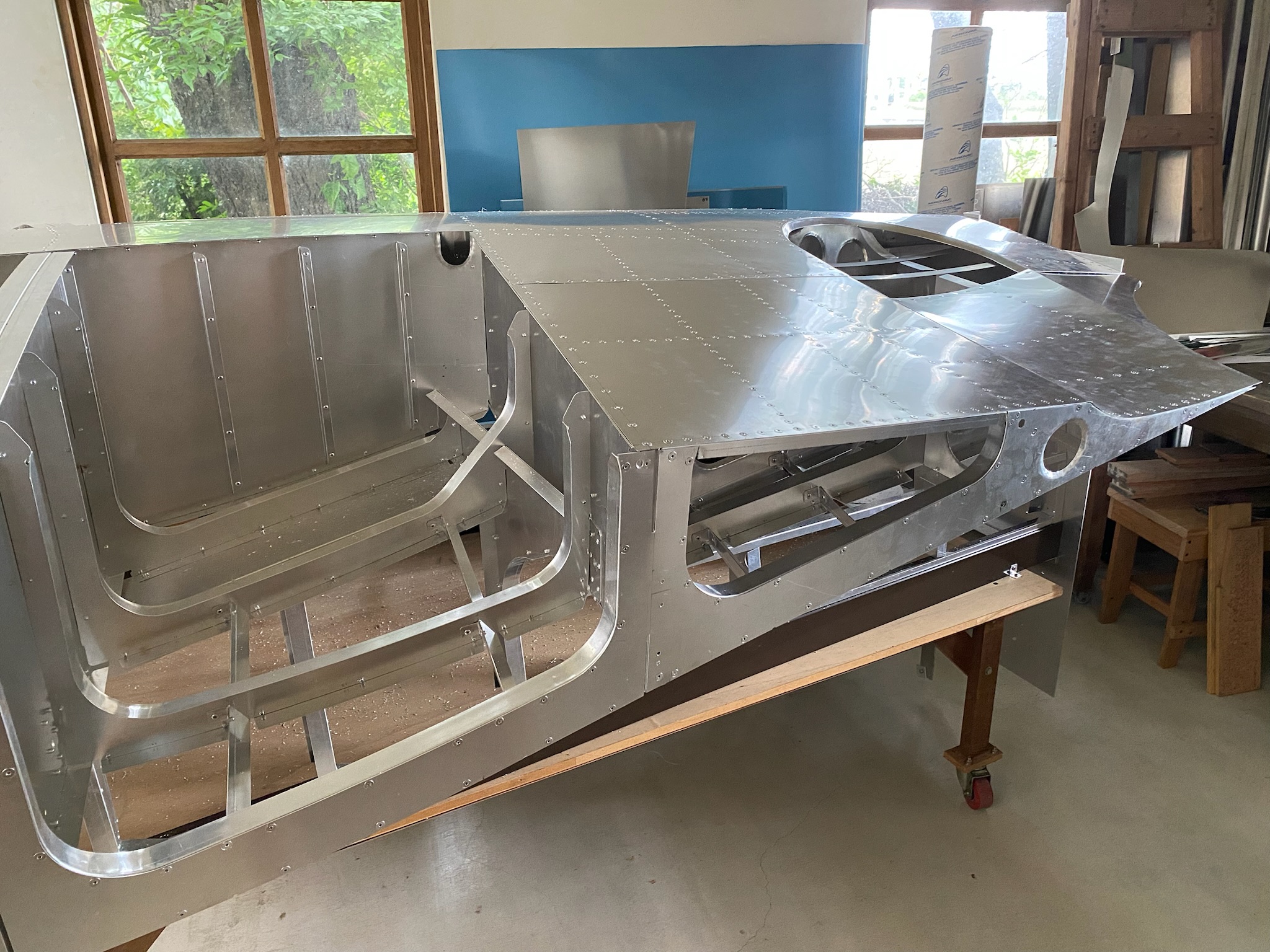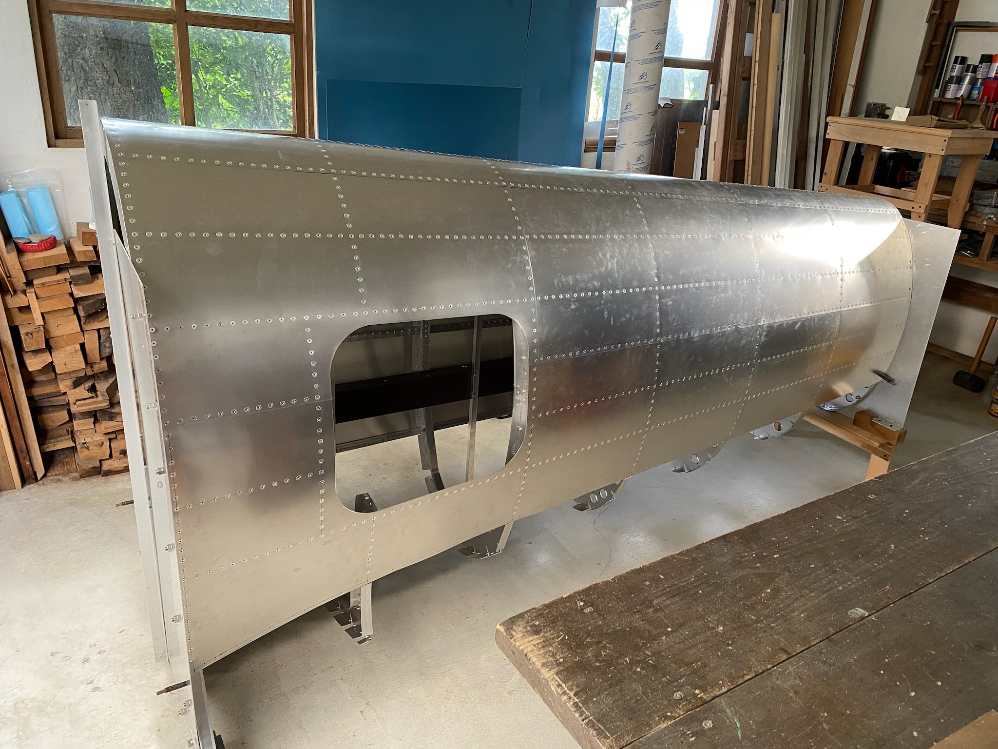 這個部分與前段機身的主翼結合處有一個很漂亮的曲線。這個曲線製作起來具有挑戰性,需要用到橡膠槌和牛皮沙袋以及英國輪(輪鈑金機)。外板上的長方形開口,是一個緊急出入口。