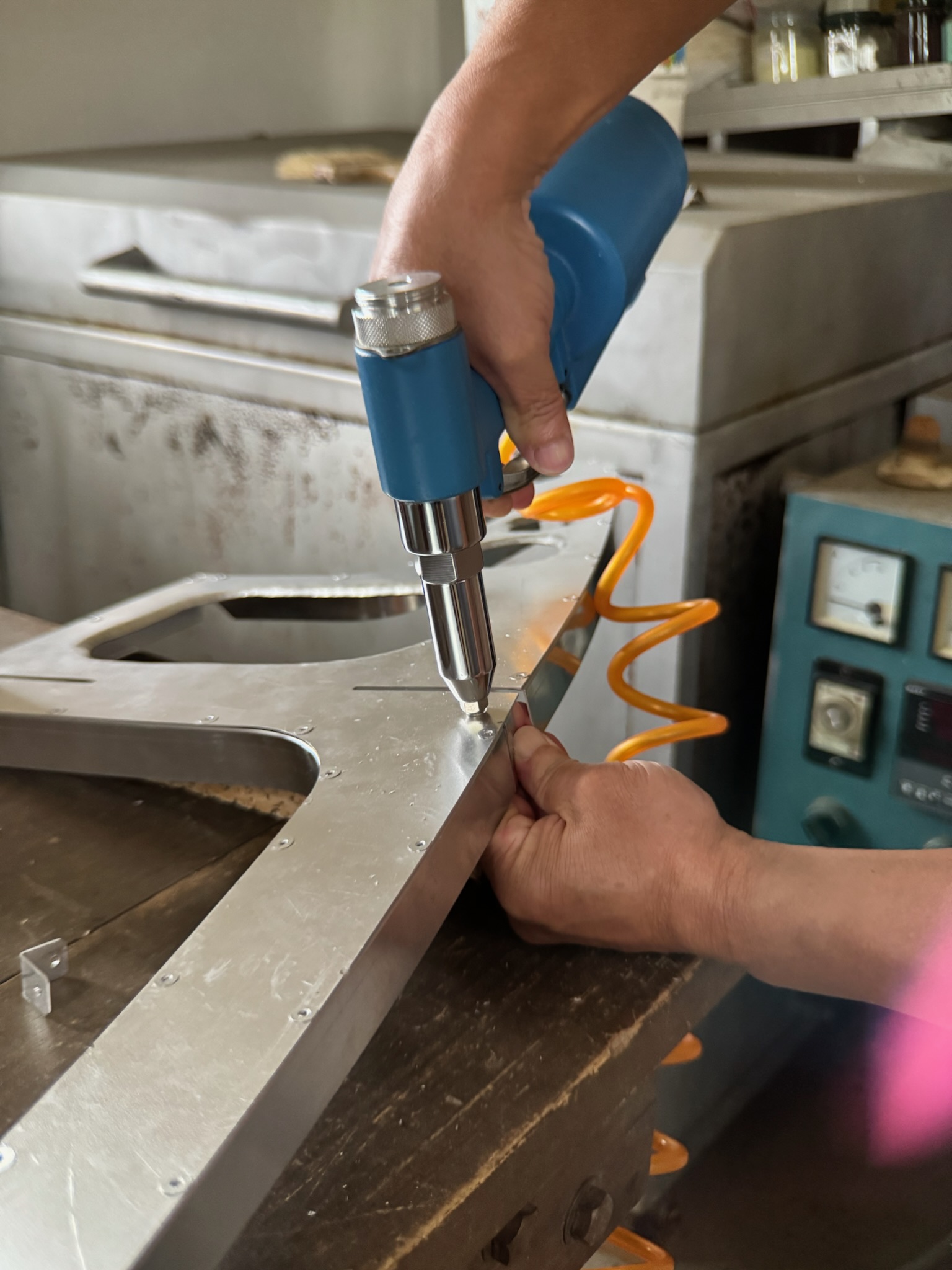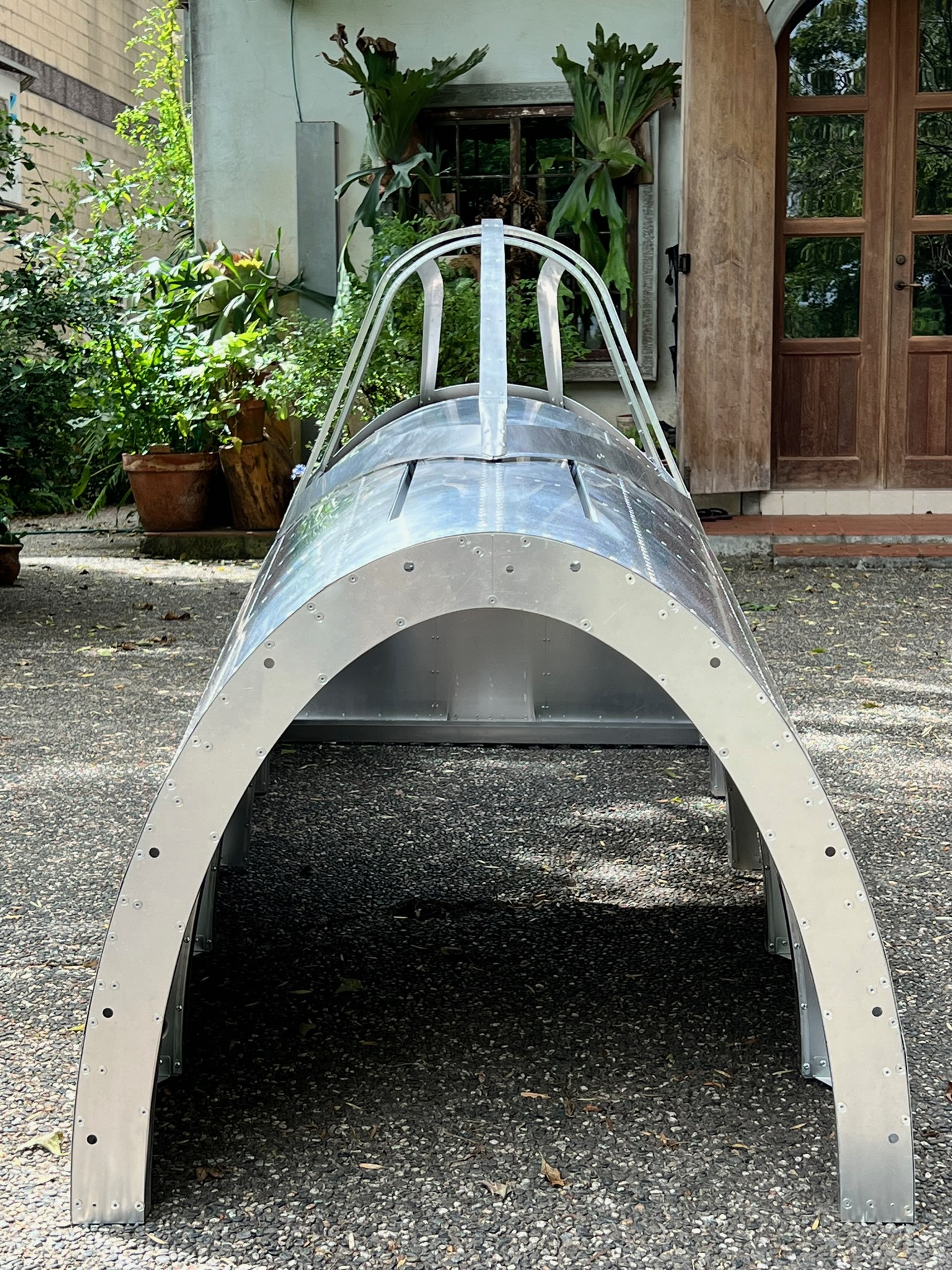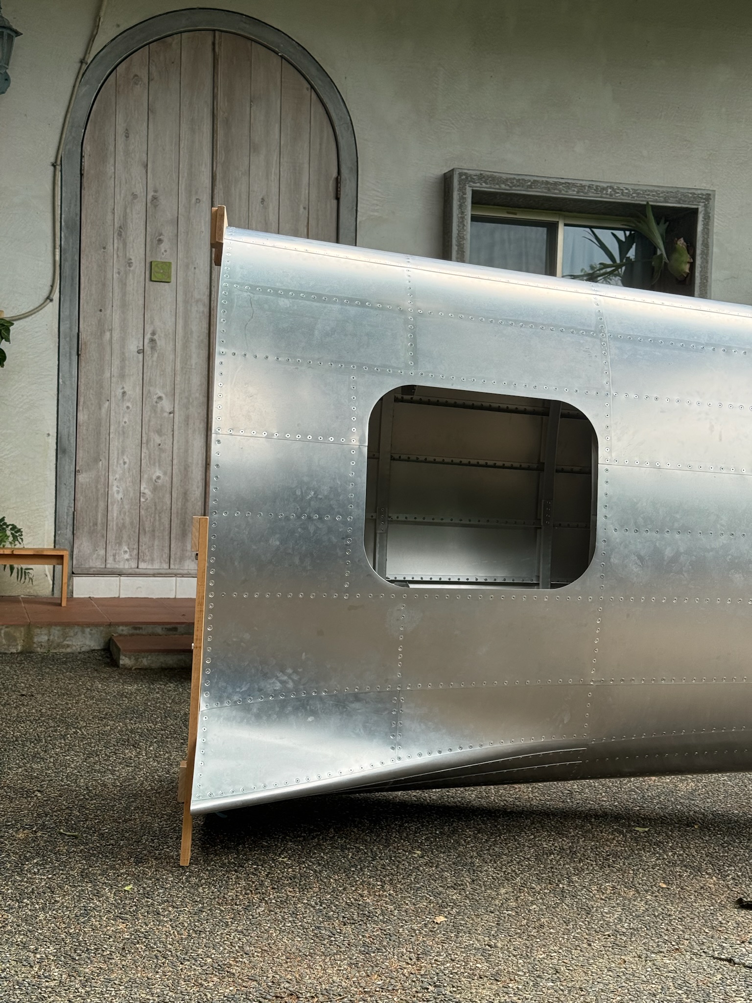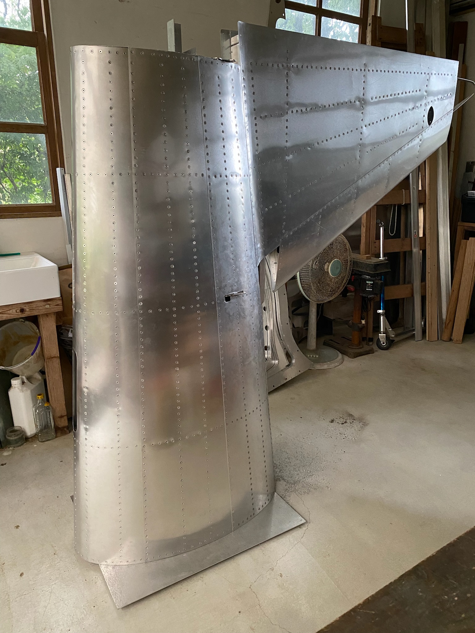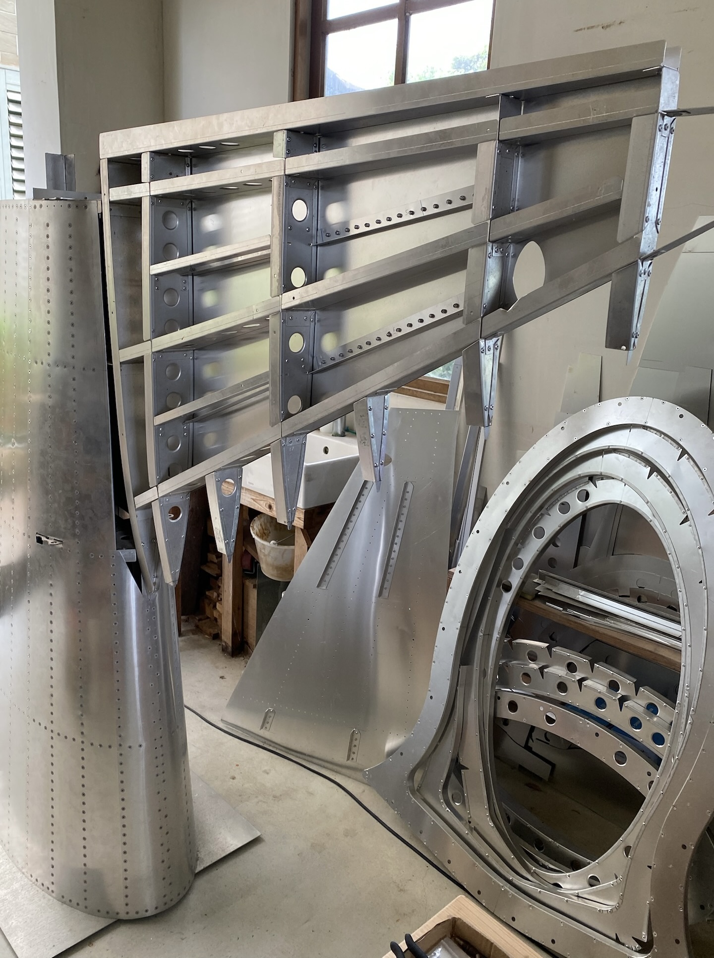 這個部分與前段機身的主翼結合處有一個很漂亮的曲線。這個曲線製作起來具有挑戰性,需要用到橡膠槌和牛皮沙袋以及英國輪(輪鈑金機)。外板上的長方形開口,是一個緊急出入口。