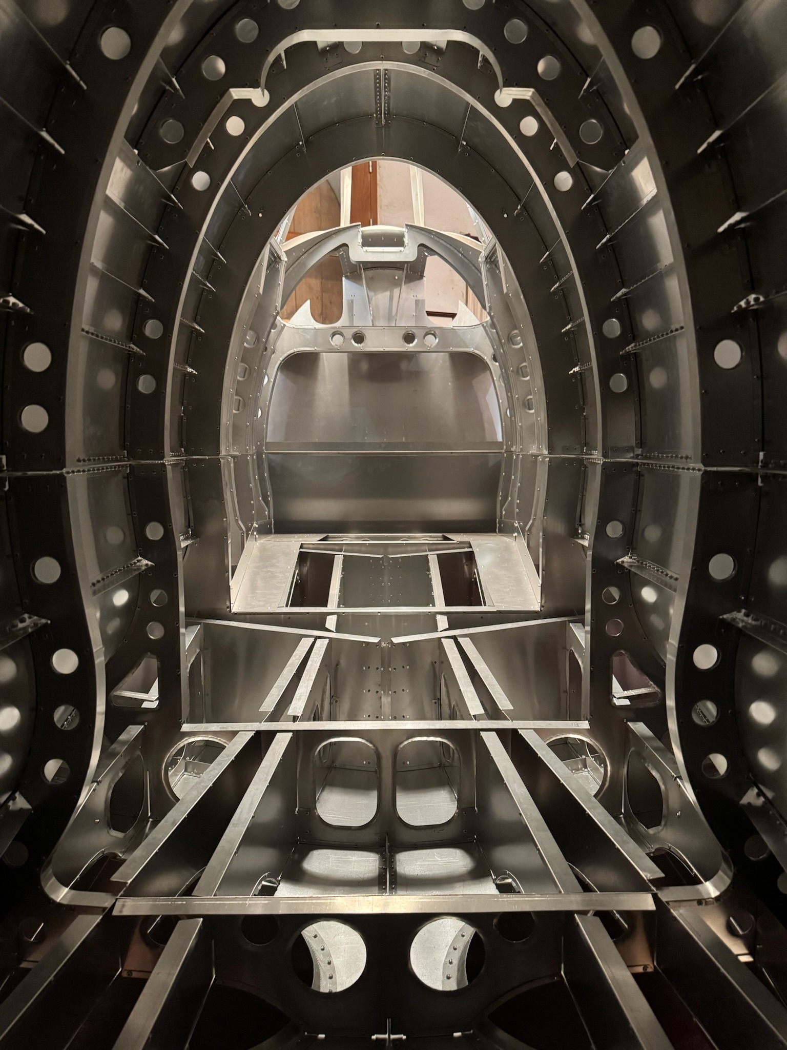 從尾部開始,試驗一些工法的可行性。外板和結構採用低風阻的沉頭拉鉚釘固定,使機體外型看起來簡潔洗鍊。